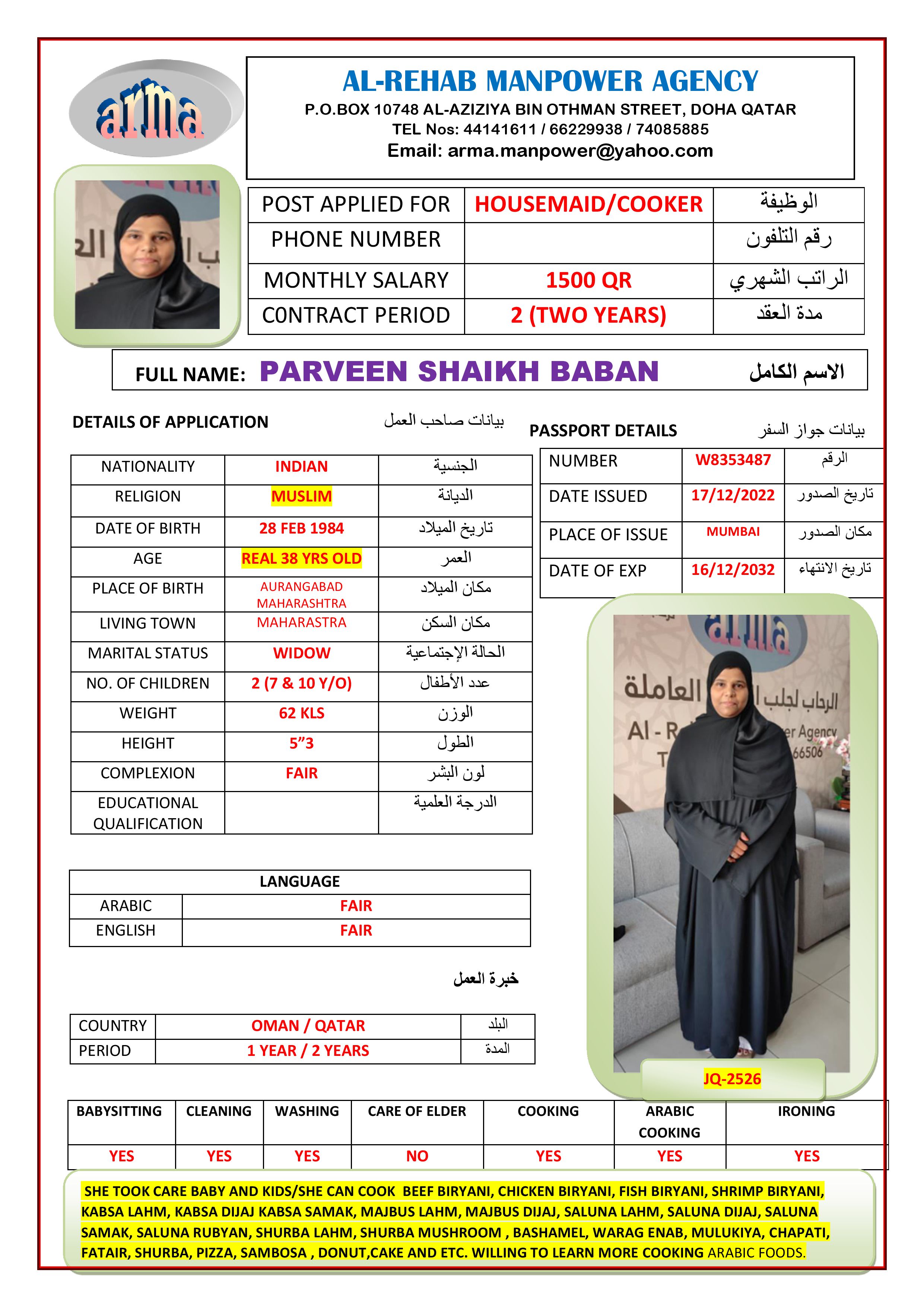 يمكنها القيام بجميع الأعمال المنزلية. يمكن طهي الأطعمة العربية مثل برياني لحم البقر، برياني الدجاج، برياني الروبيان، كبسة لحم، كبسة ديجاج، مجبوس، صالونة لحام، صالونة مجبوس والمزيد.