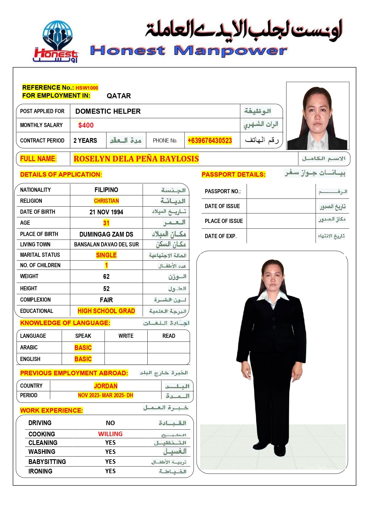 الاسم - عربي ROSELYN DELA PEÑA BAYLOSIS -