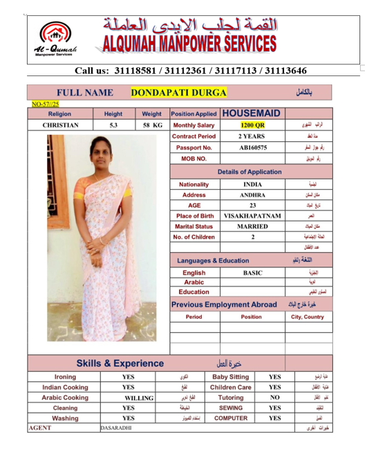 الاسم - عربي DURGA DONDAPATI ( غير متاحه مؤقتا. تم اختيارها من قبل عميل آخر وفي وانتظار تأكيد الحجز)