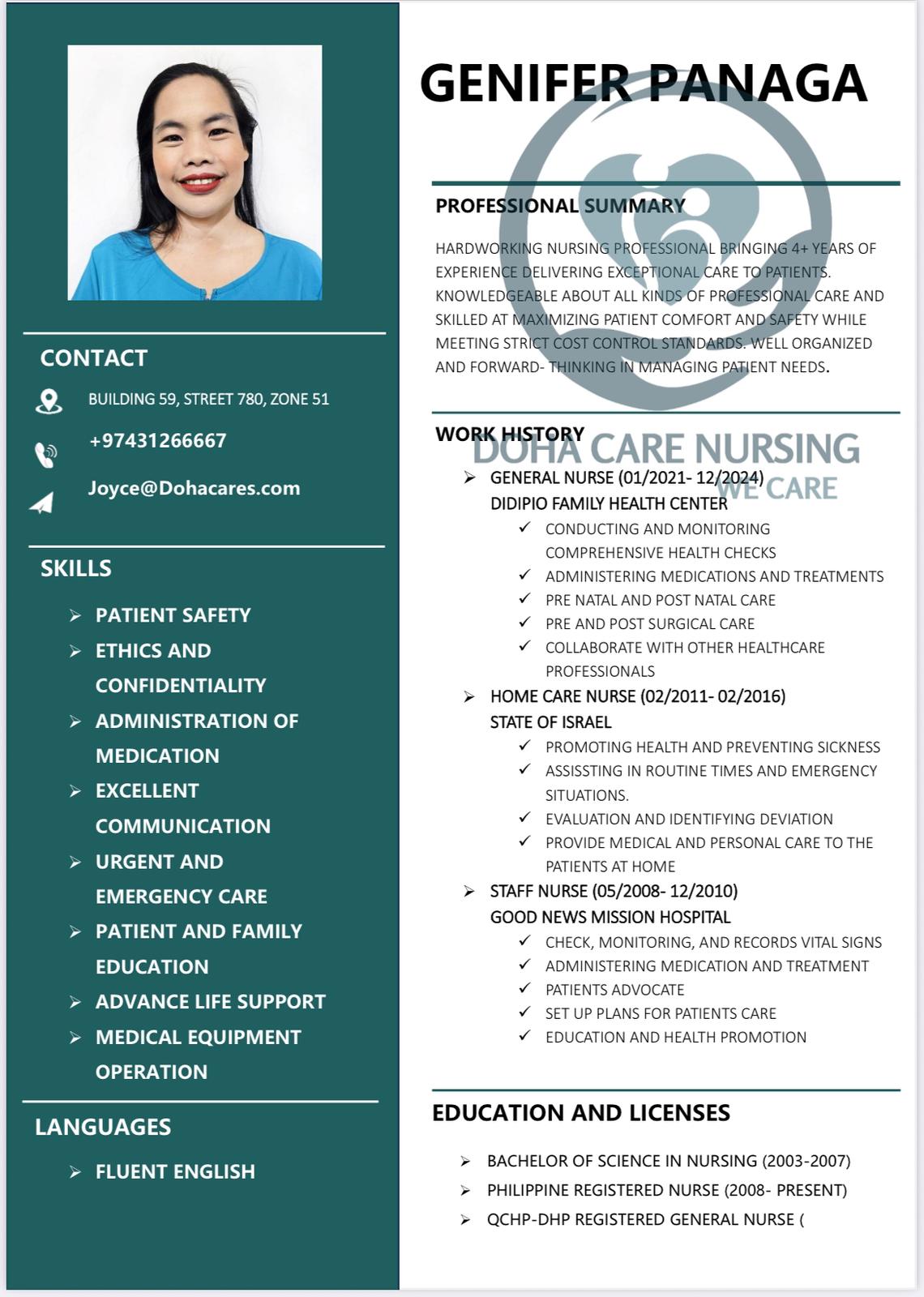تحياتي من شركة دوحة كير للتمريض شركتنا توفر ممرضة مؤهلة و مقدم رعاية من الفيليبين بخبرة ممتازة لكل من الاطفال حديثي الولادة و كبار السن مع خدمة جيدة شكرا لكم.