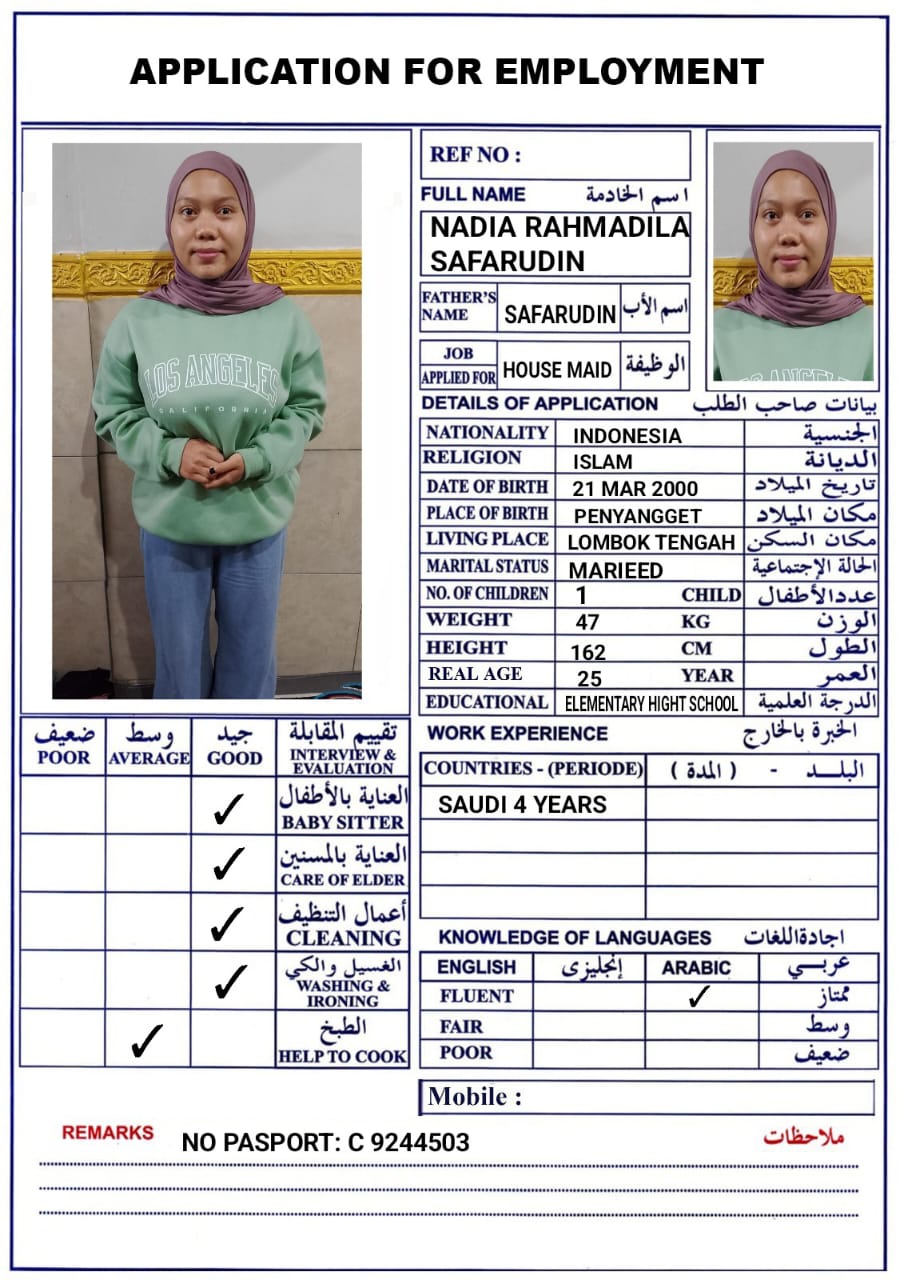 الاسم - عربي NADIA RAHMADILA SAFARUDIN