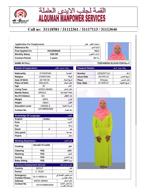 الاسم - عربي TESFAMESH ELICHO FENTA