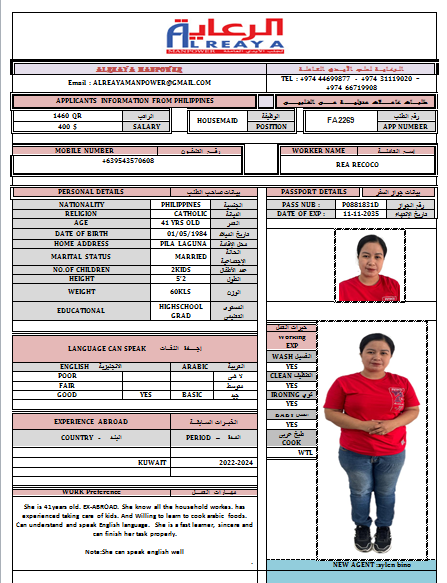 | She is 41years old. EX-ABROAD. She know all the household workes. has experienced taking care of kids. And Willing to learn to cook arabic foods. Can understand and speak English language. She is a fast learner, sincere and can finish her task properly. Note:She can speak english well | |