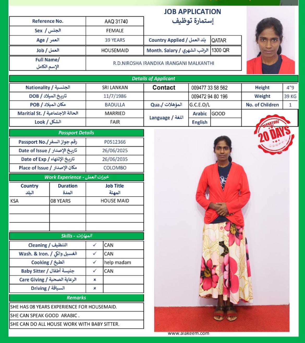 الاسم - عربي R.D. NIROSHA IRANDIKA IRINGANI MALKANTHI