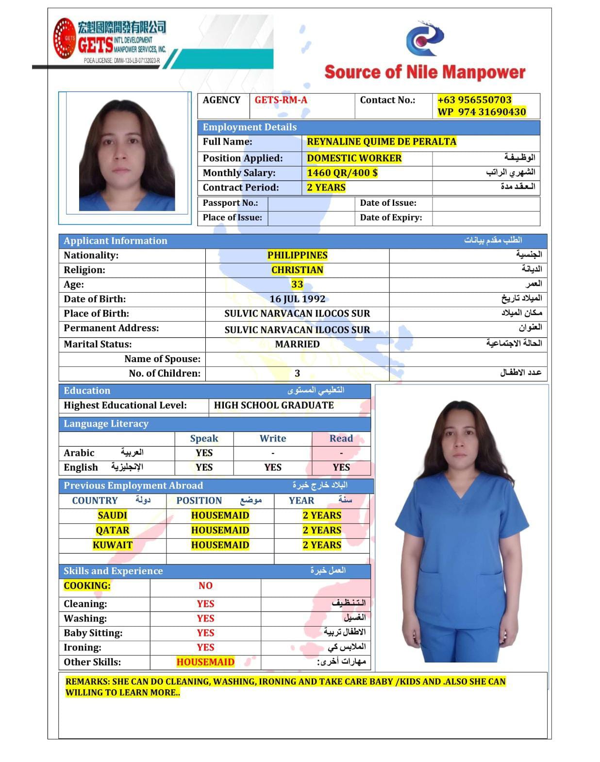 الاسم - عربي REYNALINE QUIME DE PERALTA