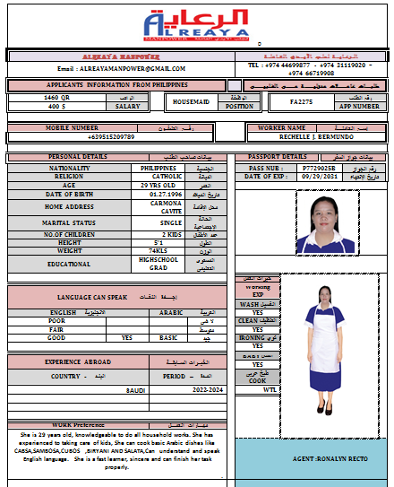 | الاسم - عربي | RECHELLE BERMUNDO |