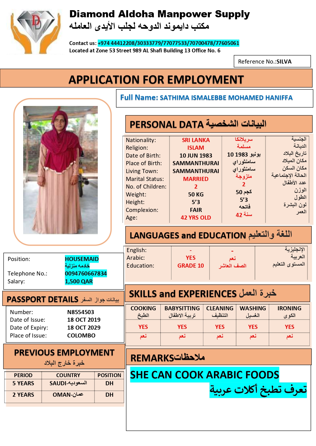الاسم - عربي SATHIMA ISMALEBBE MOHAMED HANIFFA