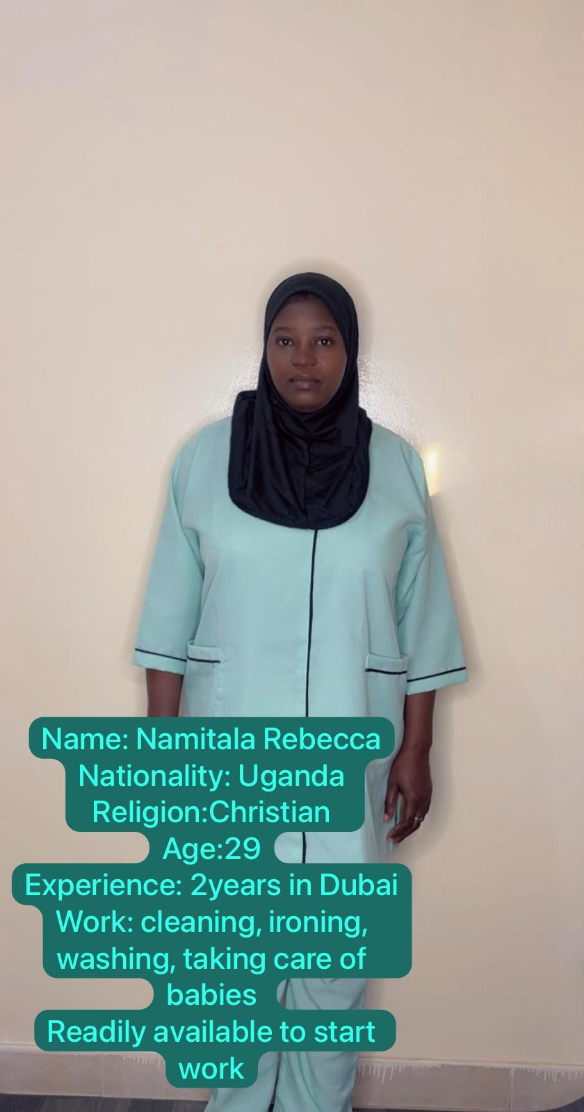 ريبيكا من أوغندا، يمكنها التنظيف والكي والغسيل ورعاية الأطفال، ولديها خبرة لمدة عامين في دبي. وهي متاحة في قطر وجاهزة لبدء العمل. الراتب 1800 ورسوم المكتب 500 ريال قطري. لمزيد من التفاصيل تواصل مع شركة أوربان روك للتجارة والخدمات على الرقم 71610363. وشكراً