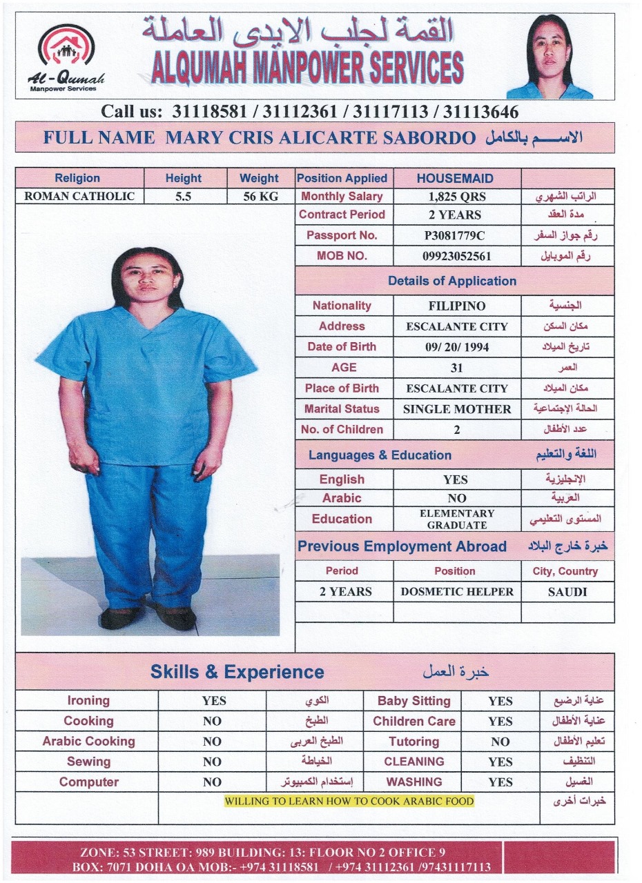 الاسم - عربي MARY CRIS ALICARTE SABORDO
