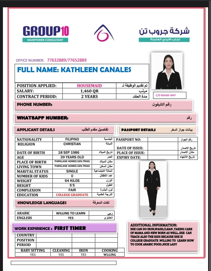 الاسم - عربي KATHLEEN CANALES /PHILIPPINE HOUSEMAID