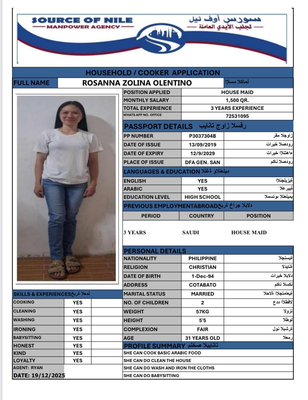 الاسم - عربي ROSANNA ZOLINA OLENTINO