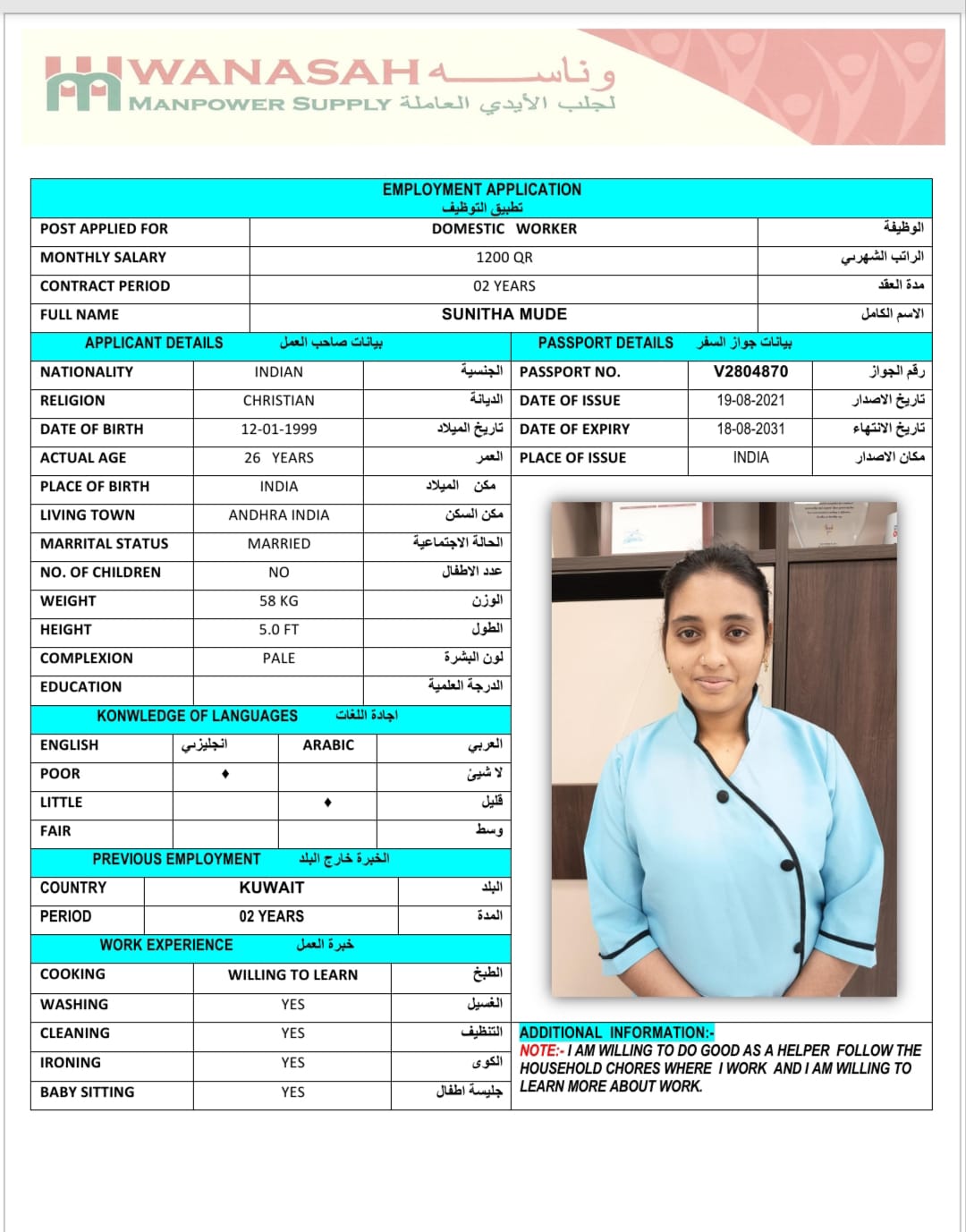 الاسم - عربي SUNITHA MUDE / AVAILABLE IN DOHA