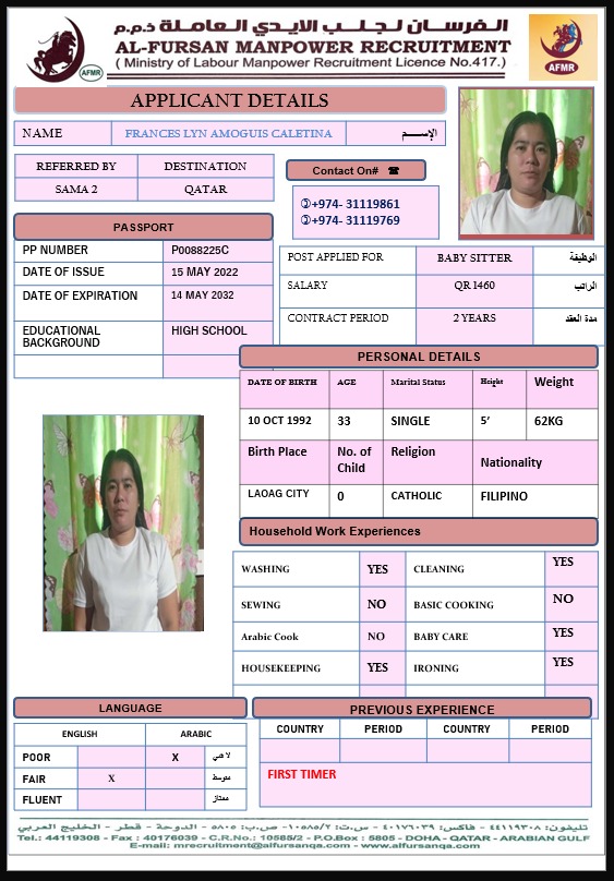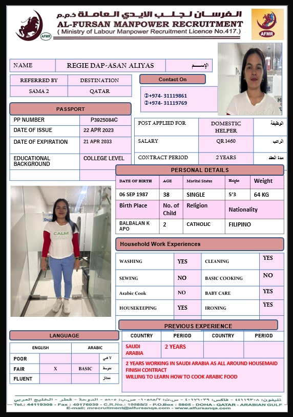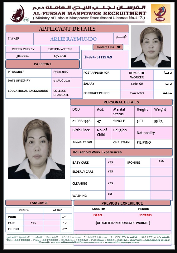 Dear customers Al Fursan Manpower office has 30 years of experience in bringing applicants We provide domestic workers with experience in the Gulf, Muslim and non-Muslim Cooks, nannies, clean, laundry and ironing, and child and elderly care Available from the following nationalities:- Philippines, arrival within 45 days, price 15 thousand India, arrival within a month, price 14 thousand Bangladesh, arrival within 45 days, price 13 thousand We also provide Indian drivers, Qatari and Gulf licenses To contact 77715901 (Arabic speaker)