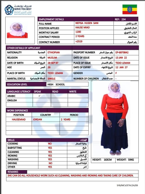 SHE CAN CLEAN WASH IRON BABYSITING AND HELP TO COOK