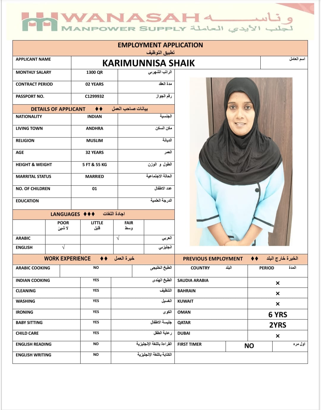 Name - English KARIMUNNISA SHAIK / AVAILABLE IN DOHA