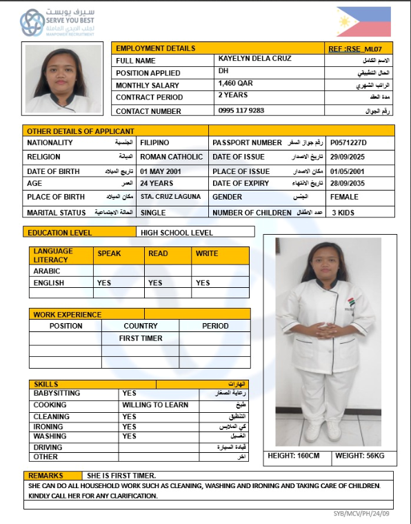 SHE CAN CLEAN WASH IRON BABYSITING AND WILLING TI LEARN COOK.