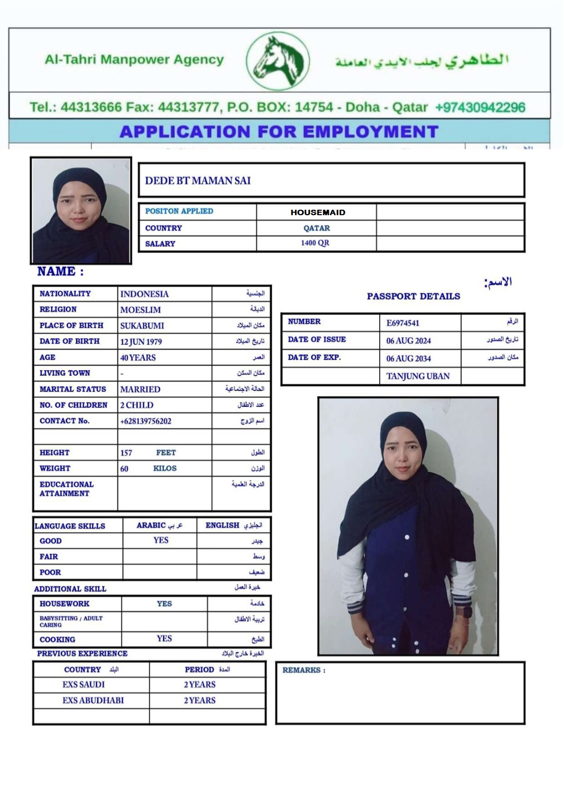SHE CAN COOK, SHE CAN CLEAN, WASH AND IRON THE CLOTHES, SHE CAN SPEAK BOTH ENGLISH AND ARABIC.