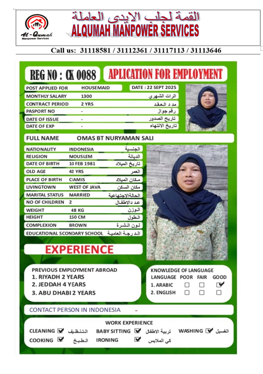 Welcome Are you looking for a driver, nurse, house manager, cleaner, nanny, secretary, professional workers for companies, security and guard personnel, foreman .... etc. Have you spent a long time looking for a maid? Have you made a great effort to find the right person? But to no avail ... Don't worry, we have the perfect solution to your problem Services…