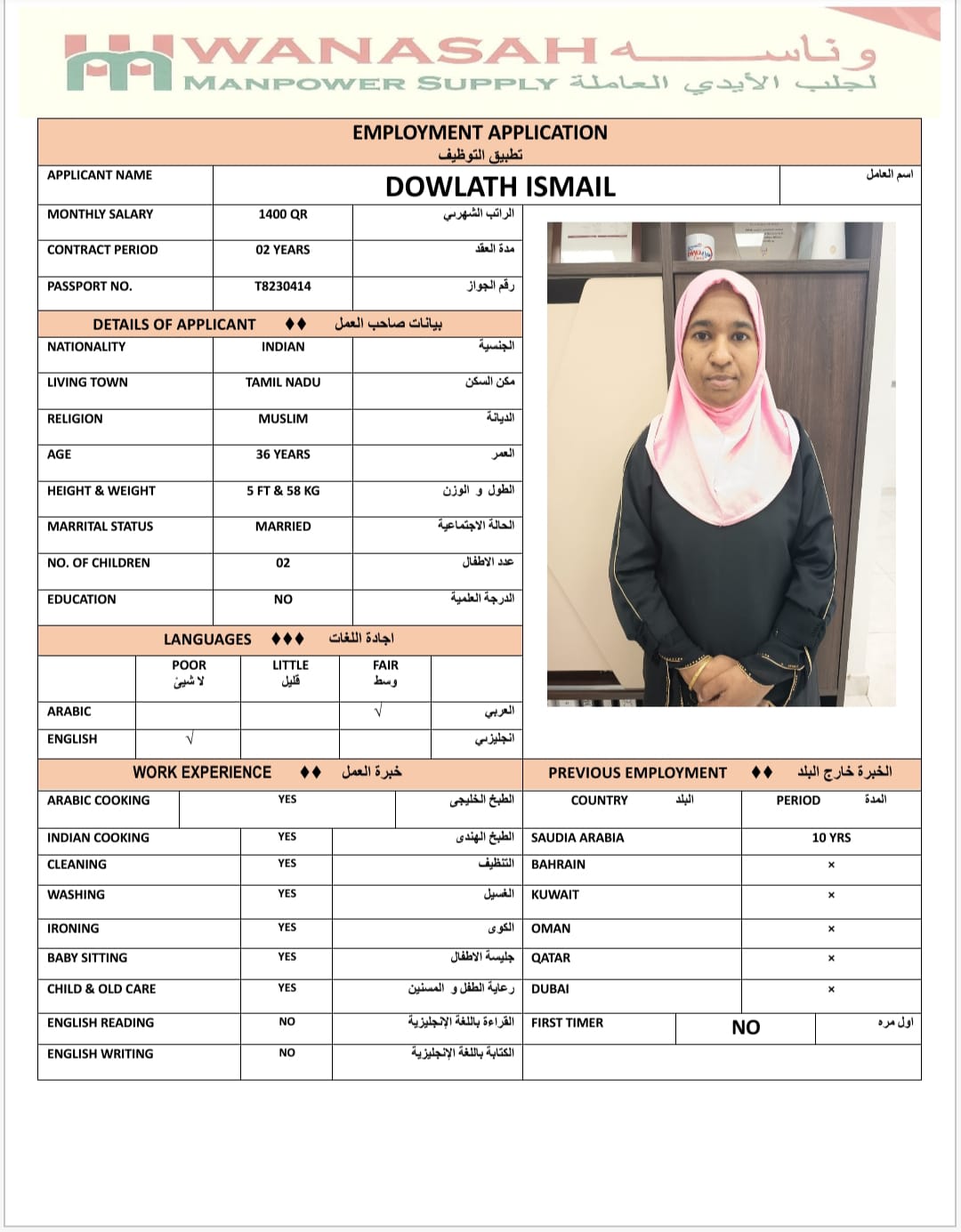 Name - English DOWLATH ISMAIL / AVAILABLE IN DOHA