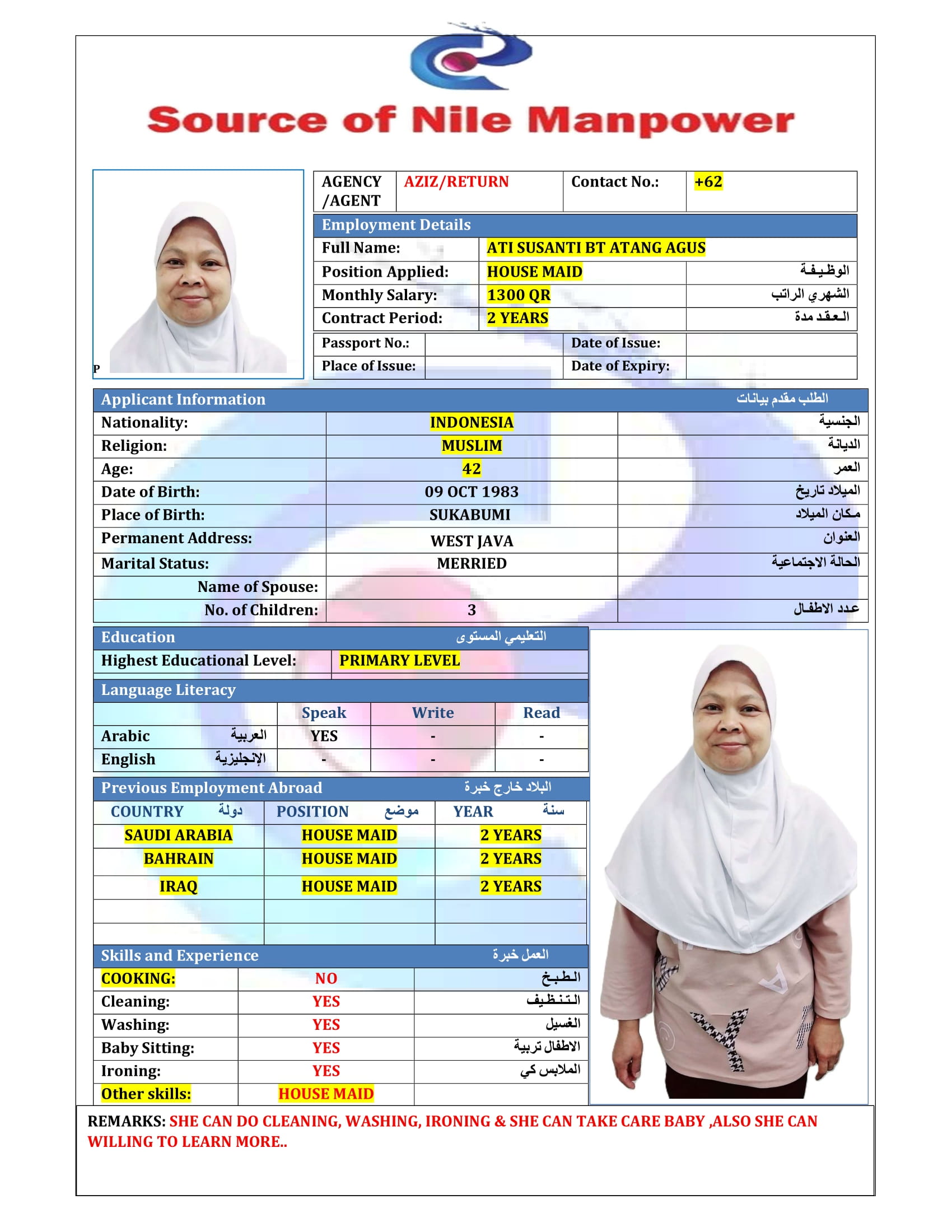 Name - English ATI SUSANTI BT ATANG AGUS - INDONESIA HARD WORKER