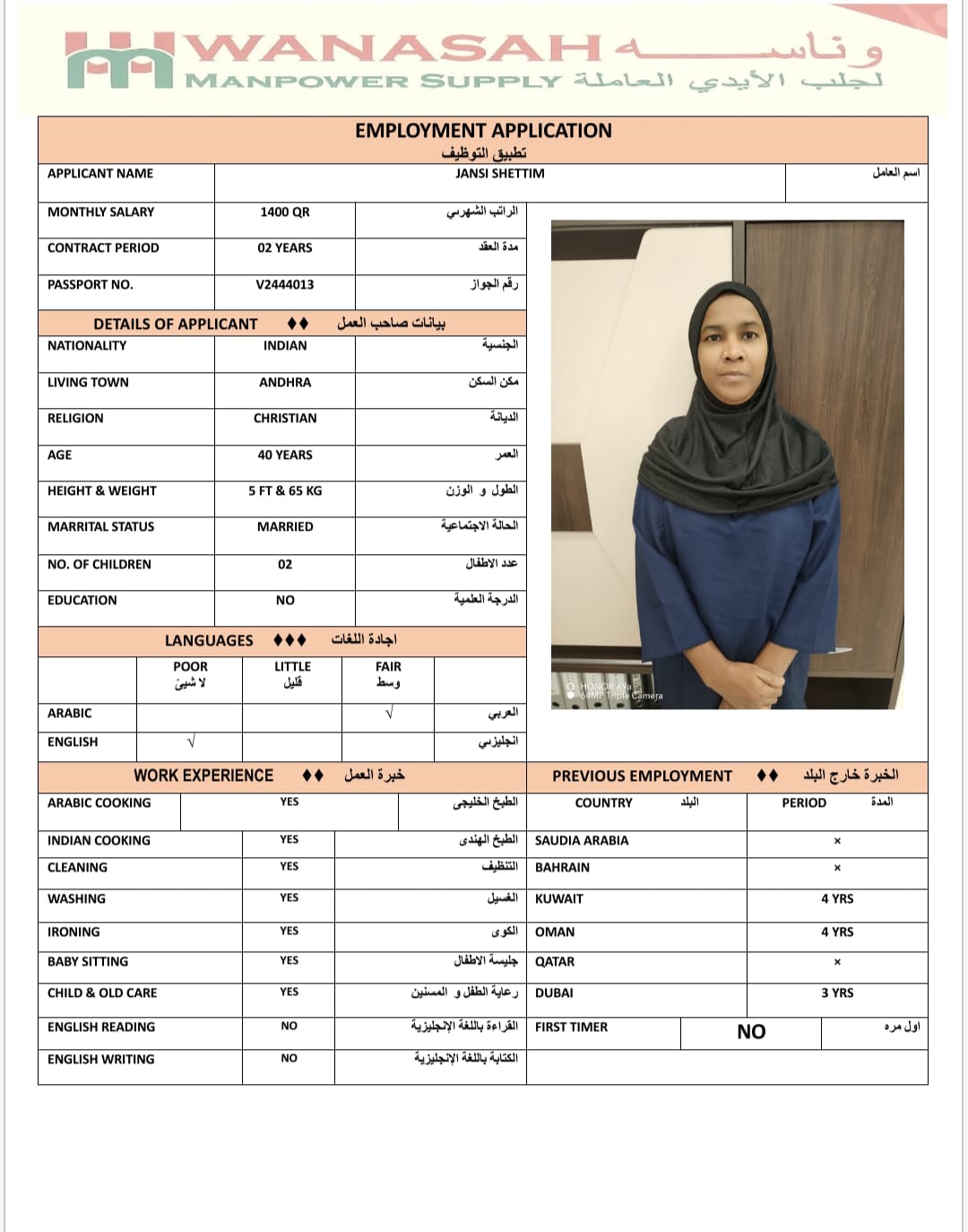 Name - English JANSI SHETTIM / AVAILABLE IN DOHA