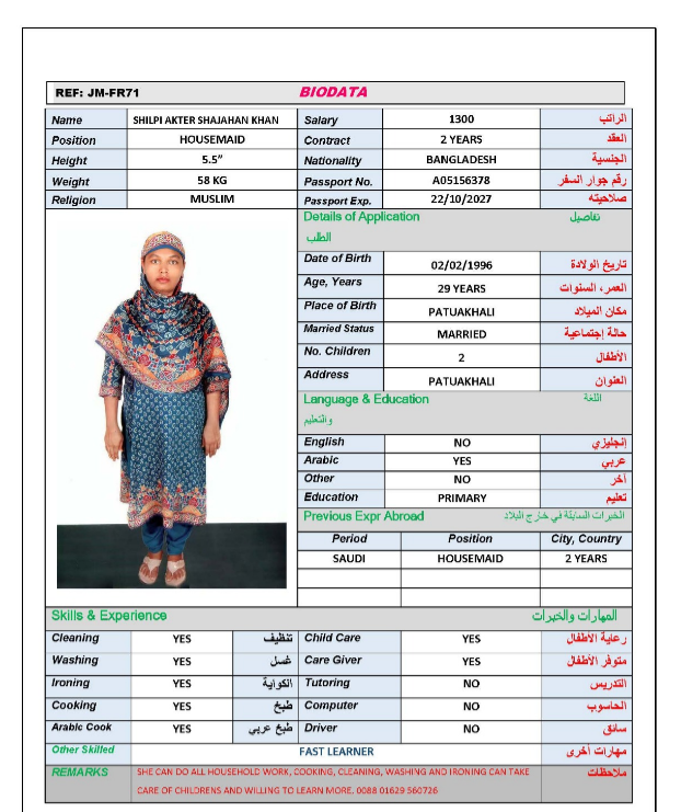 SHE KNOWS CLEANING WASHING IRONING AND TAKE CARE OF BABY SHE CAN COOK LITTLE ARABIC FOOD WILLING TO LEARN MORE