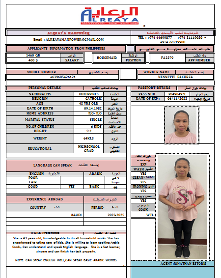 experienced to taking care of kids, She is willing to learn cooking Arabic
