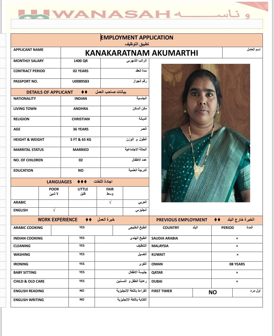 Name - English KANAKARATNAM AKUMARTHI / COOK