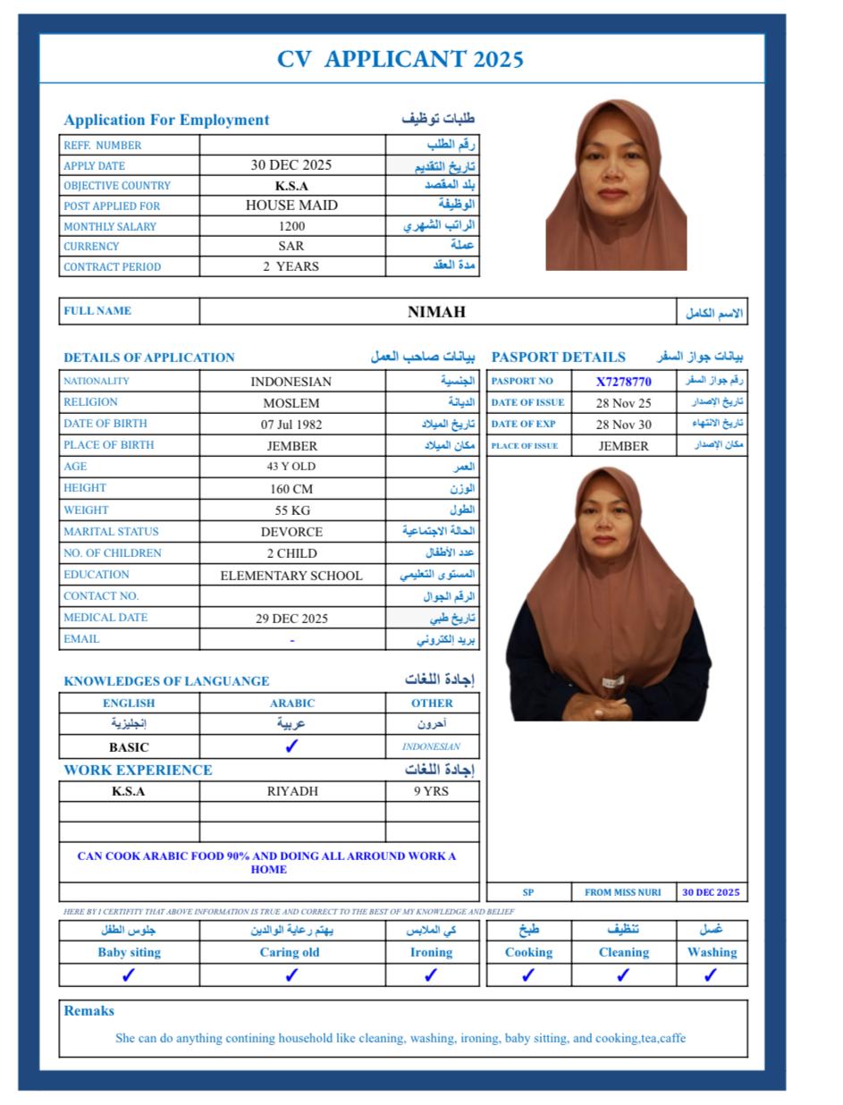 | SHE CAN COOK BASIC ARABIC FOOD SHE CAN TAKE CARE OF KIDS SHE CAN TAKE GOOD CARE OF CHILDREN WILLING TO LEARN HOW TO COOK ARABIC FOOD | |