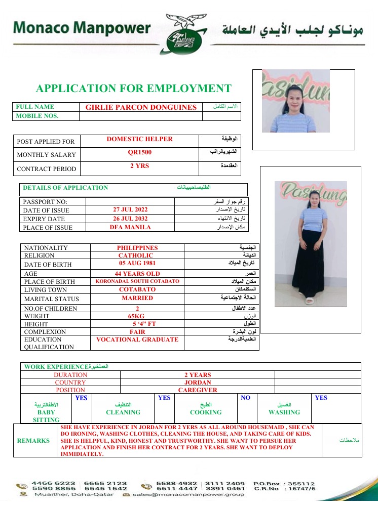 SHE HAVE EXPERIENCE IN JORDAN FOR 2 YERS AS ALL AROUND HOUSEMAID, SHE CAN DO IRONING, WASHING CLOTHES, CLEANING THE HOUSE, AND TAKING CARE OF KIDS. SHE IS HELPFUL, KIND, HONEST AND TRUSTWORTHY. SHE WANT TO PERSUE HER APPLICATION AND FINISH HER CONTRACT FOR 2 YEARS. SHE WANT TO DEPLOY IMMIDIATELY.