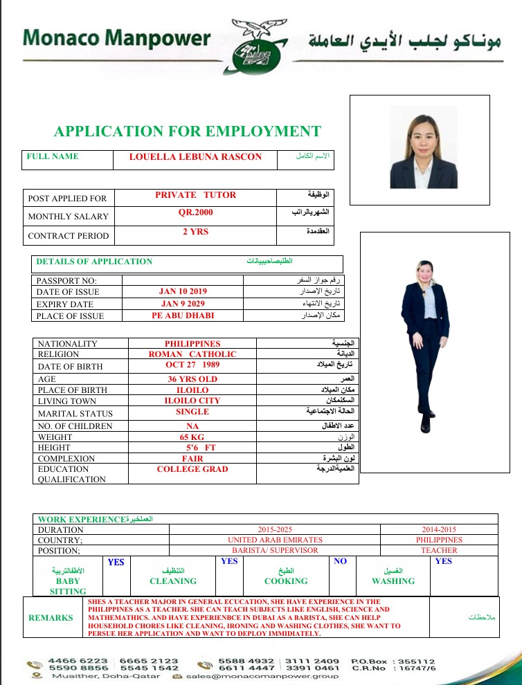 SHES A TEACHER MAJOR IN GENERAL ECUCATION, SHE HAVE EXPERIENCE IN THE PHILIPPINES AS A TEACHER. SHE CAN TEACH SUBJECTS LIKE ENGLISH, SCIENCE AND MATHEMATHICS. AND HAVE EXPERIENBCE IN DUBAI AS A BARISTA, SHE CAN HELP HOUSEHOLD CHORES LIKE CLEANING, IRONING AND WASHING CLOTHES, SHE WANT TO PERSUE HER APPLICATION AND WANT TO DEPLOY IMMIDIATELY.