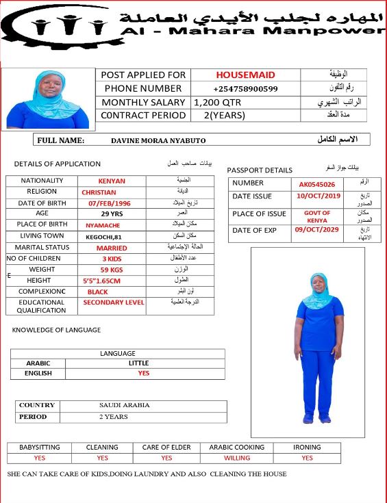 | SHE IS 29 YRS OLD WITH 3 KIDS SHE IS A HIGH SCHOOL LEVEL SHE CAN SPEAK AND UNDERSTAND ENGLISH GOOD SHE CAN DO ALL HOUSEHOLD WORKS SHE CAN TAKE CARE OF CHILDREN AND ELDERLY SHE IS WILLING TO LEARN ARABIC COOKING AND MORE | |