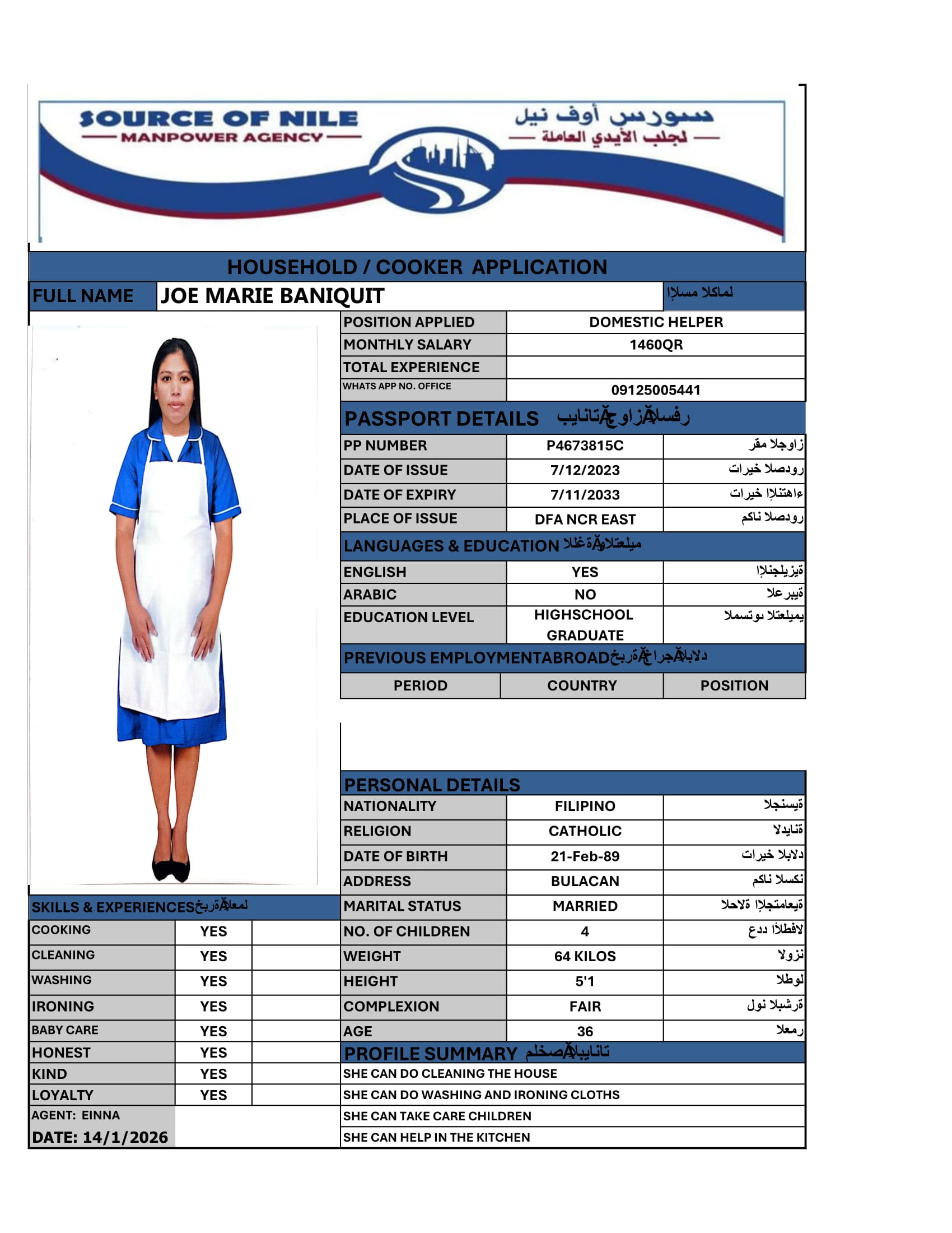 Salary 1,460 QR. QAR