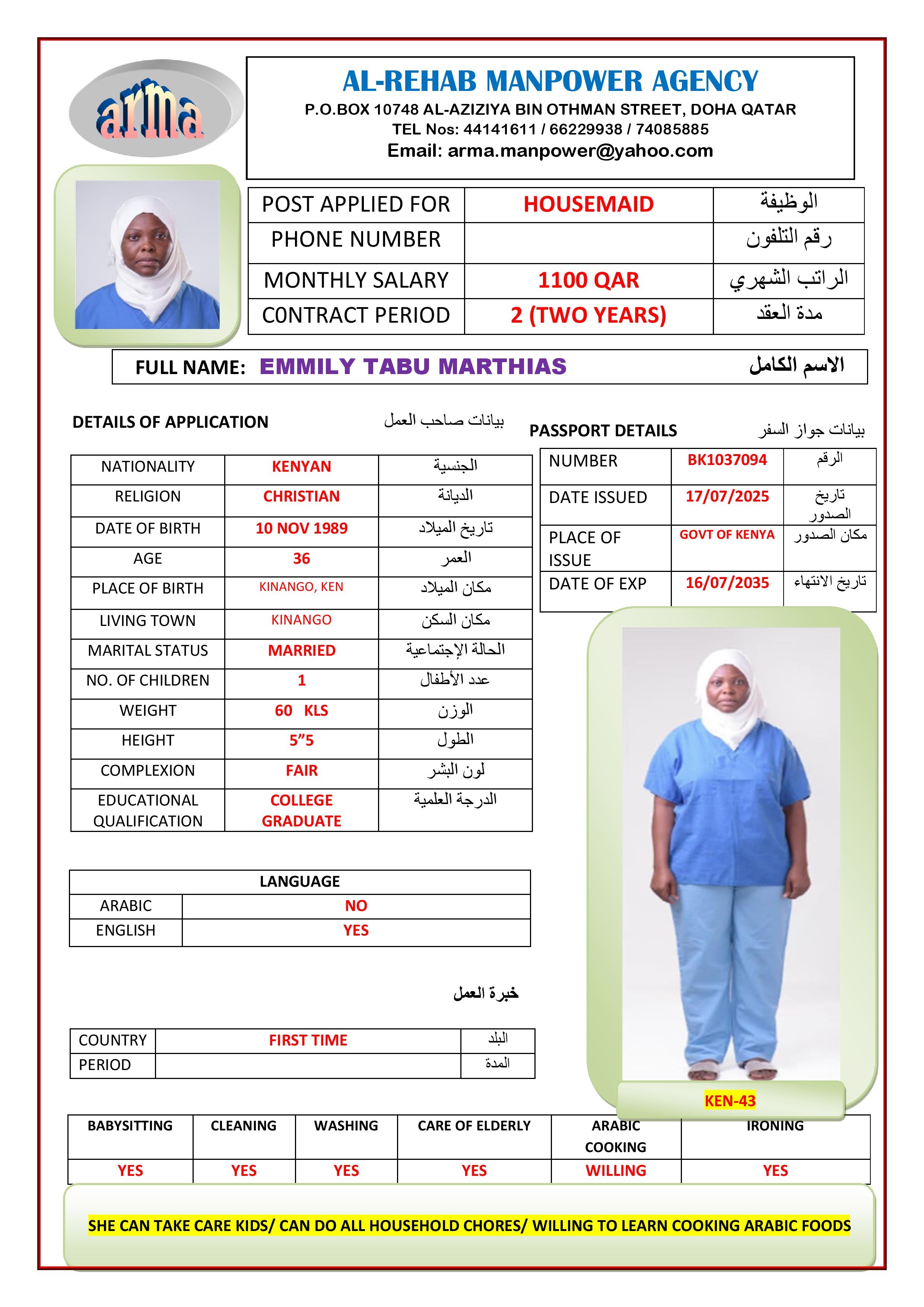 SHE CAN TAKE OF KIDS/ CAN DO ALL HOUSEHOLDS CHORES AND WILLING TO LEARN COOKING ARABIC FOODS