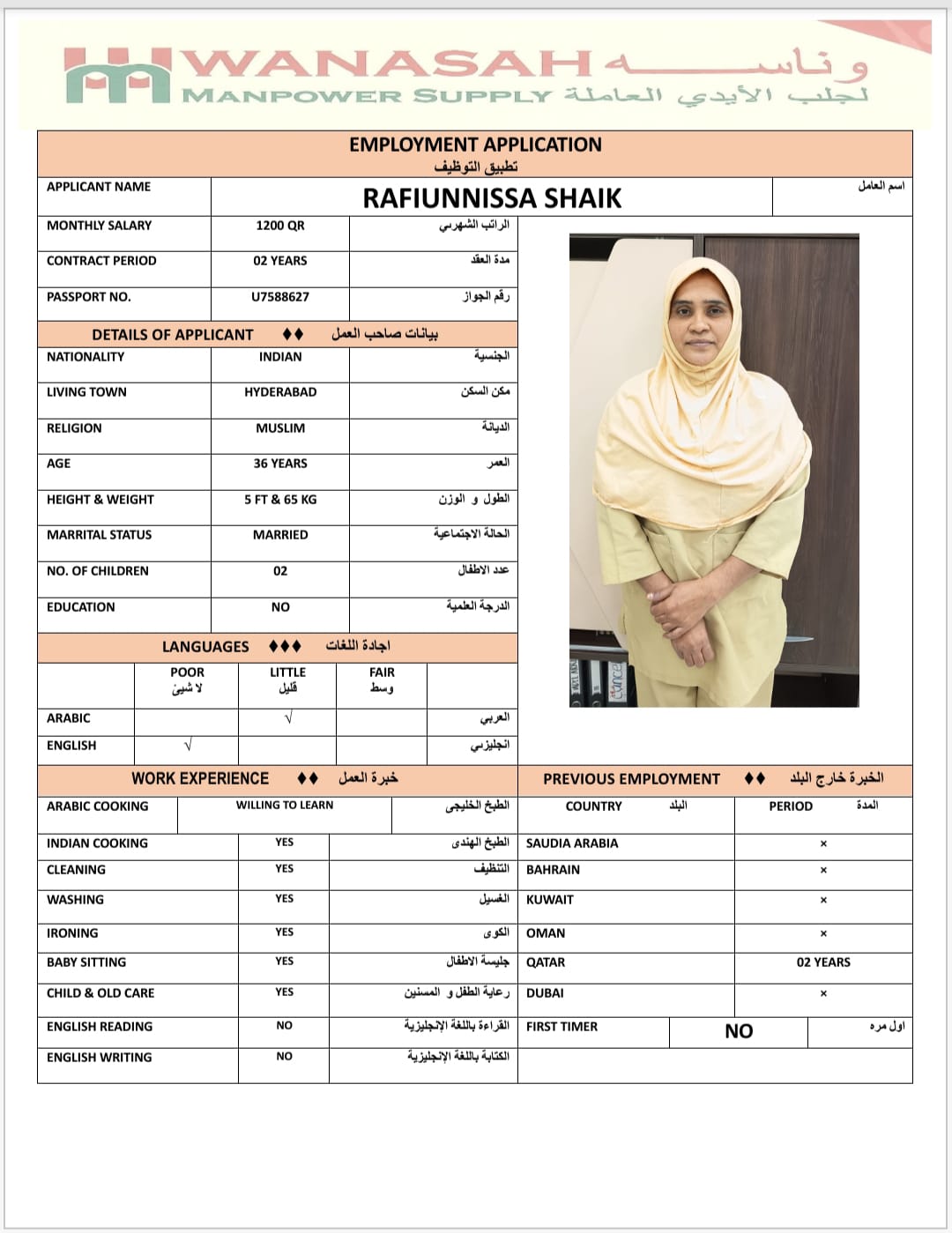 Name - English RAFIUNNISA SHAIK / AVAILABLE IN DOHA