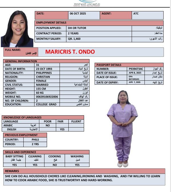 SHES A LICENSE TEACHER IN PHILIPPINES CAN DO ALL HOUSEHOLD CHORES AND WILLING TO LEARN HOW TO COOK AN ARABIC .