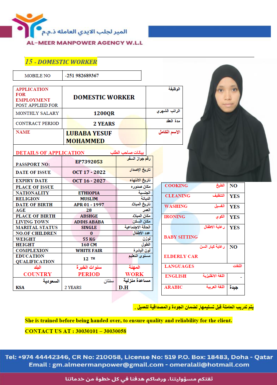 لحجز العامل من الشركة المسؤولة عنه اضغط على ايقونه الواتس اب أو الإتصال