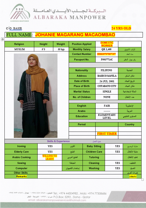 | Name | JOHANIE MAGARANG MACAOMBAO |