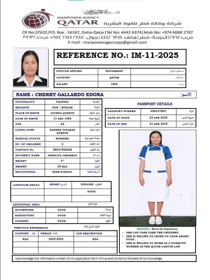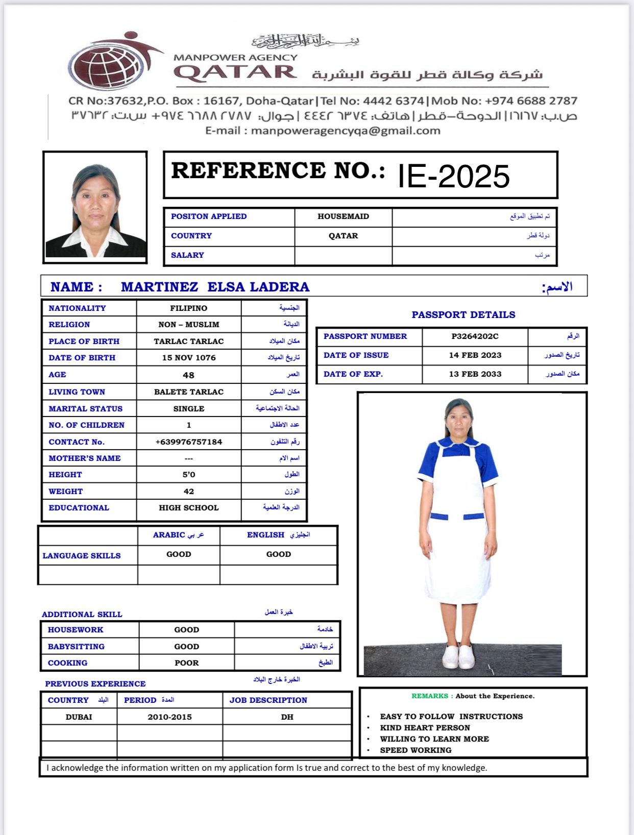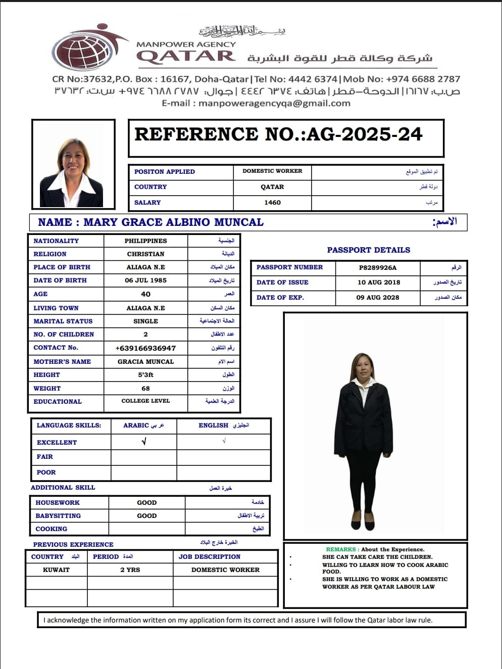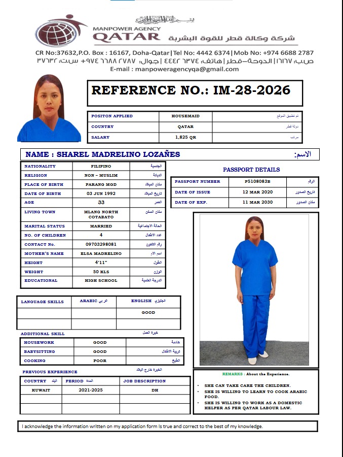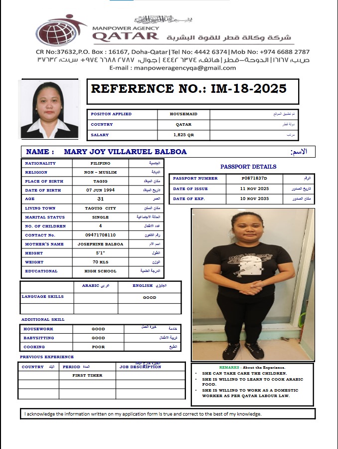 نحن من وكالة القوى العاملة في قطر ووكالة مرخصة. نحن نوفر الخادمات والسائقين ومقدمي الرعاية والممرضات من الفلبين. نحن نعالج أيضًا جميع طلبات العمل للشركات وصيد الرجال ومعالجتها في الوكالة الفلبينية. إذا كان لديك أي استفسارات، فلا تتردد في الاتصال بنا على رقمنا الموضح. "سنقوم بتوظيف أفضل المواهب لفريقك"