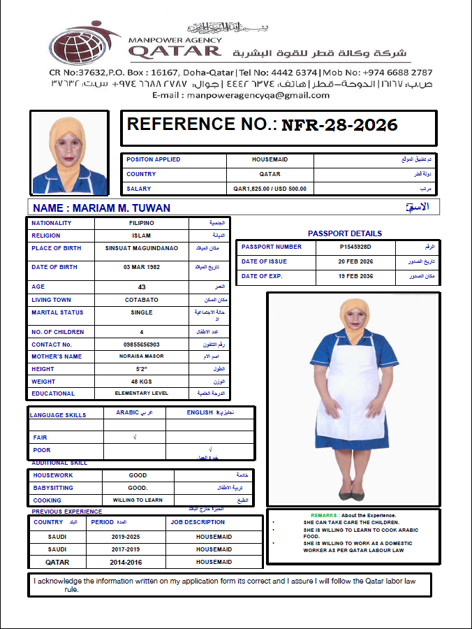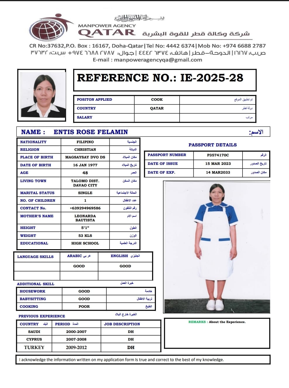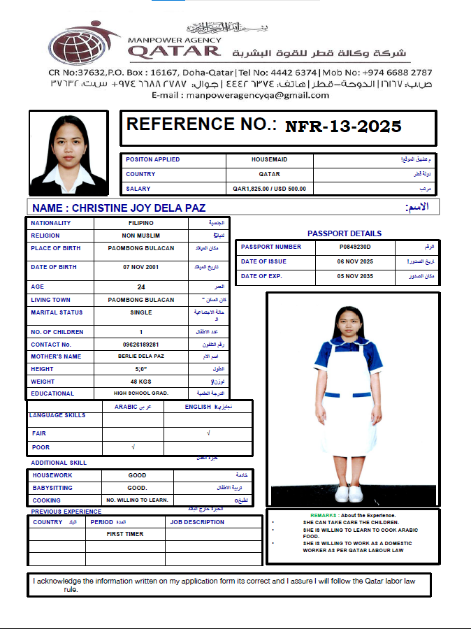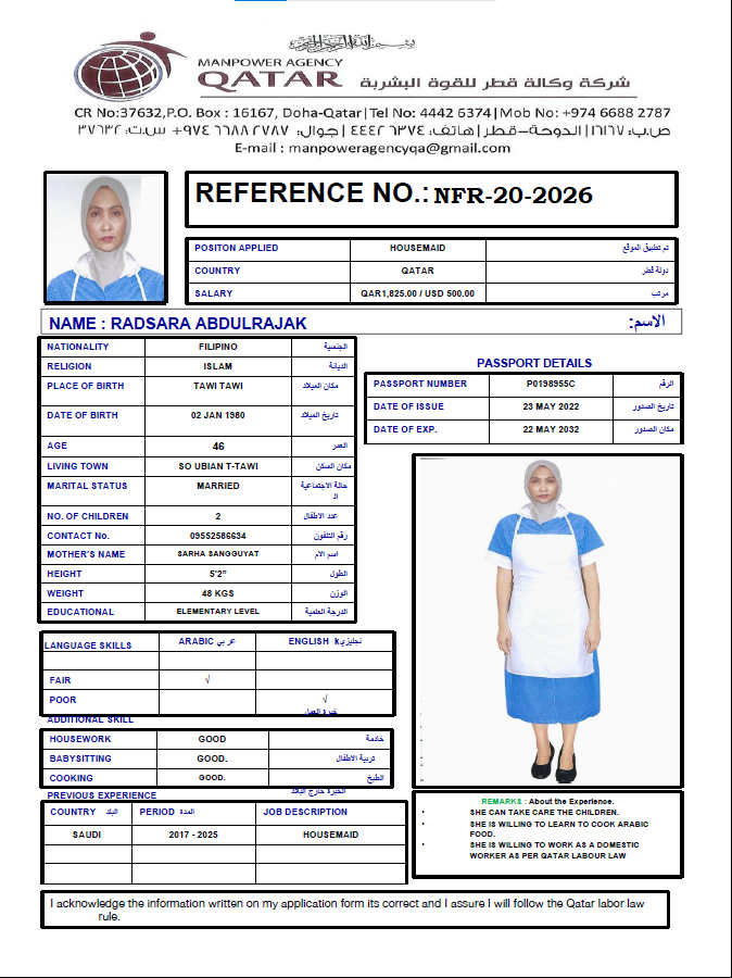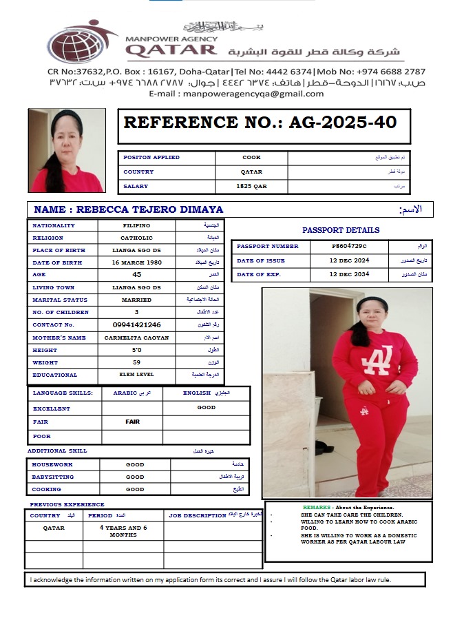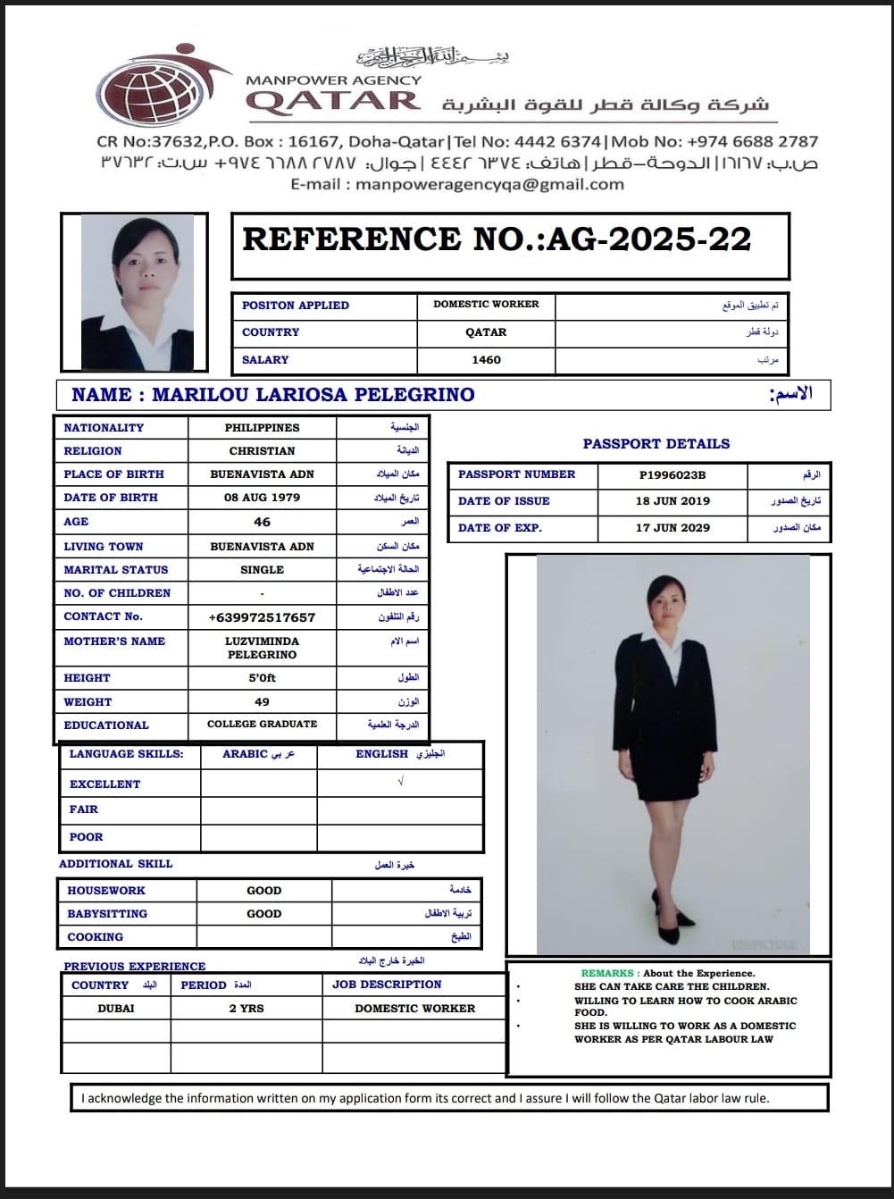 نحن من وكالة القوى العاملة في قطر ووكالة مرخصة. نحن نوفر الخادمات والسائقين ومقدمي الرعاية والممرضات من الفلبين. نحن نعالج أيضًا جميع طلبات العمل للشركات وصيد الرجال ومعالجتها في الوكالة الفلبينية. إذا كان لديك أي استفسارات، فلا تتردد في الاتصال بنا على رقمنا الموضح. "سنقوم بتوظيف أفضل المواهب لفريقك"