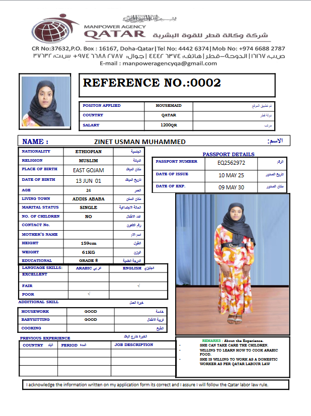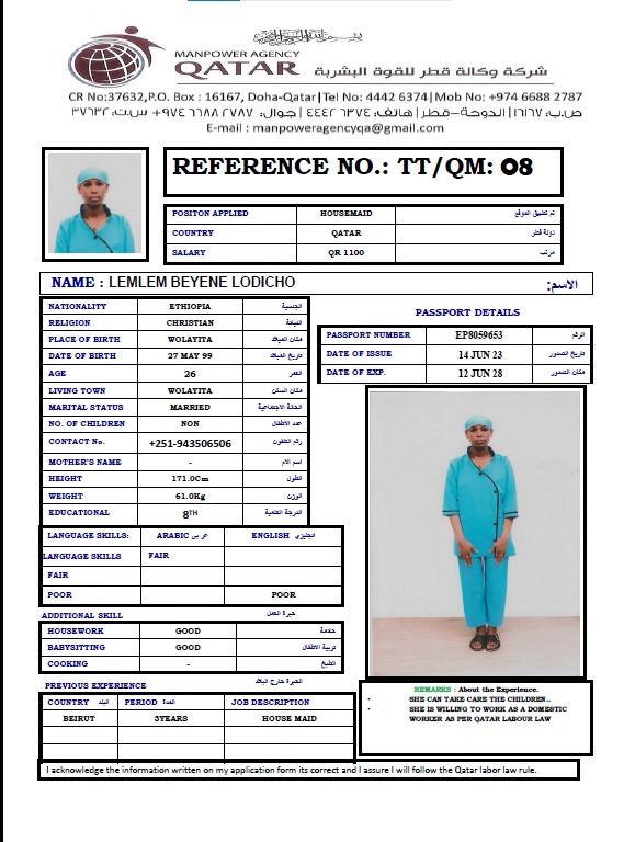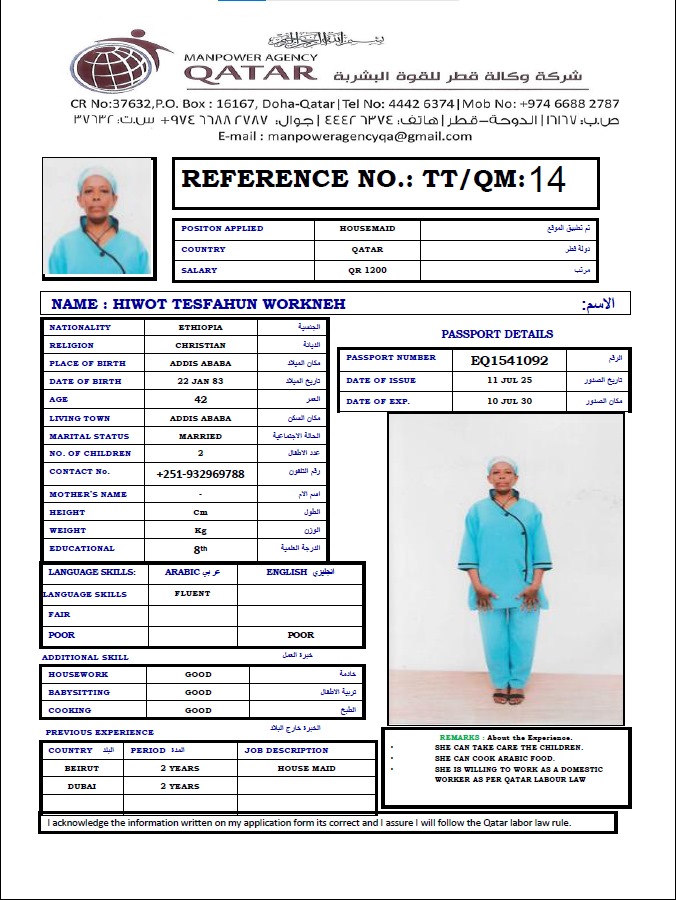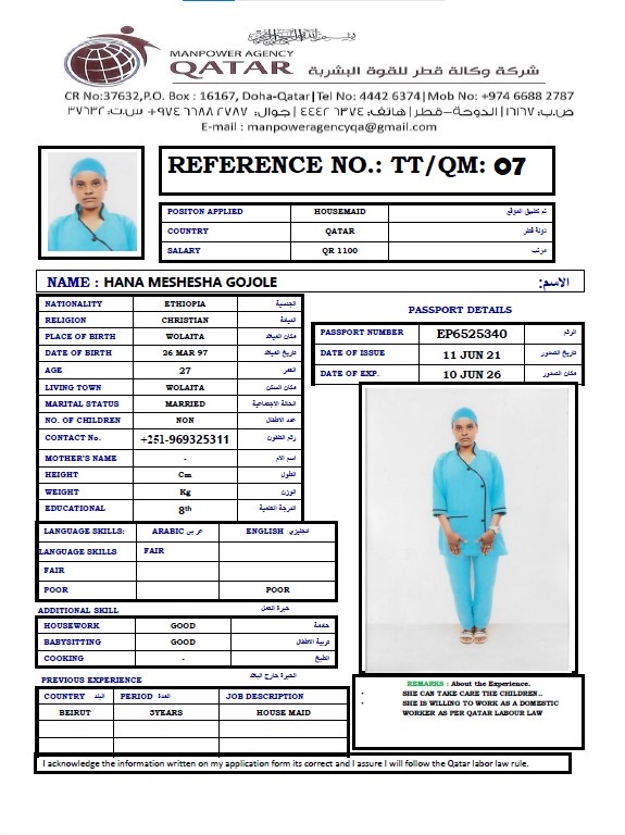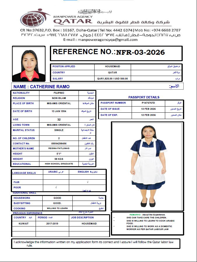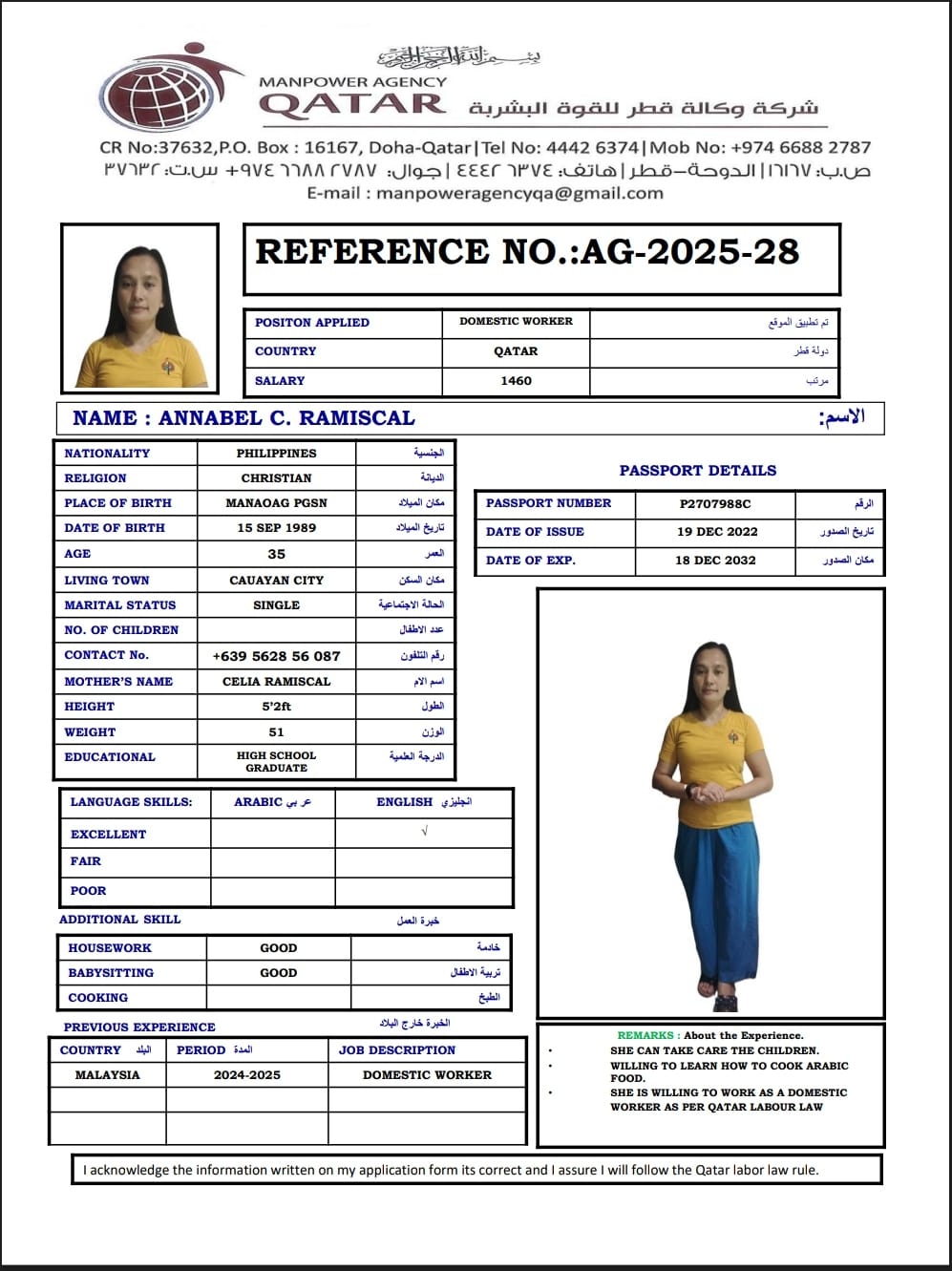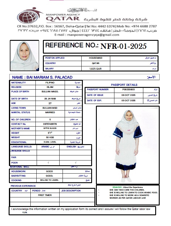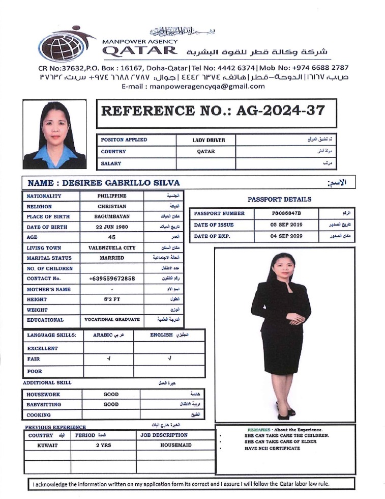 نحن من وكالة القوى العاملة في قطر ووكالة مرخصة. نحن نوفر الخادمات والسائقين ومقدمي الرعاية والممرضات من الفلبين. نحن نعالج أيضًا جميع طلبات العمل للشركات وصيد الرجال ومعالجتها في الوكالة الفلبينية. إذا كان لديك أي استفسارات، فلا تتردد في الاتصال بنا على رقمنا الموضح. "سنقوم بتوظيف أفضل المواهب لفريقك"