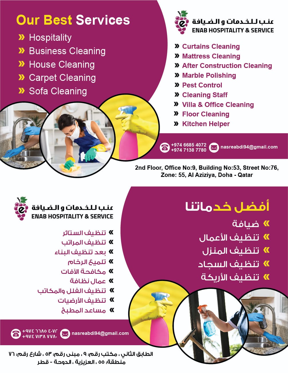 شركة "عناب للضيافة والخدمات" مزوّد موثوق لحلول التنظيف الاحترافية، حيث نقدم خدمات تنظيف شهرية وساعية مصممة لتلبية احتياجات المنازل والمكاتب والمساحات التجارية. مع تركيزنا على الجودة والموثوقية ورضا عملائنا، نضمن أن تكون كل مساحة نقدم لها خدماتنا دائمًا نظيفة ومرتبة ومريحة. نفخر بفريق التنظيف المدرب لدينا، ومنتجاتنا الصديقة للبيئة، واهتمامنا بالتفاصيل، لنقدم تجربة سلسة ومريحة لكل عميل. سواء كنت بحاجة إلى جلسة تنظيف لمرة واحدة أو خطة صيانة طويلة الأمد، فإن شركة "عناب للضيافة والخدمات" ملتزمة بتوفير الراحة والنظافة وراحة البال يوميًا. ⭐ خدماتنا التنظيف بالساعة - جلسات تنظيف مرنة وفعالة مصممة خصيصًا لجدولك الزمني. عقود تنظيف شهرية - خدمة متسقة ومخصصة للمنازل والمكاتب والمرافق. التنظيف العميق - تنظيف شامل للمطابخ والحمامات، وتجديد شامل للعقار. التنظيف عند الانتقال إلى مكان جديد/مغادرة مكان جديد خدمات تنظيف غرف الضيافة