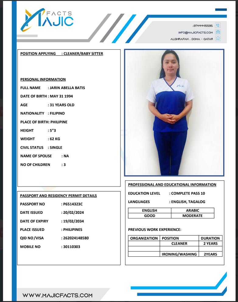 *نبذة عن الشركة* نحن شركة ماجيك فاكتس للخدمات، متخصصة في مجال الضيافة والتنظيف والخدمات. جميع موظفينا من الجنسية الفلبينية، ونقدم مجموعة متنوعة من الخدمات تشمل: - ممرضات - عاملات تنظيف - خادمات بعقود شهرية - موظفات للمطاعم والمحلات التجارية - موظفات لرعاية الأطفال وكبار السن فريقنا المتخصص جاهز للرد على جميع استفساراتكم وتلبية احتياجاتكم.