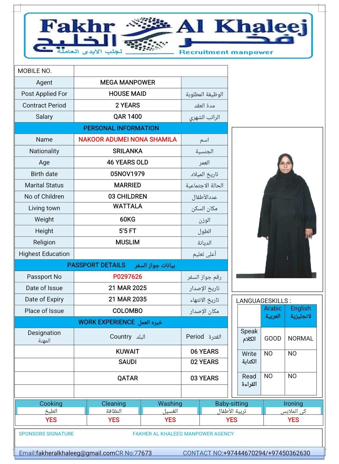 المهنة | عاملة منزلية |