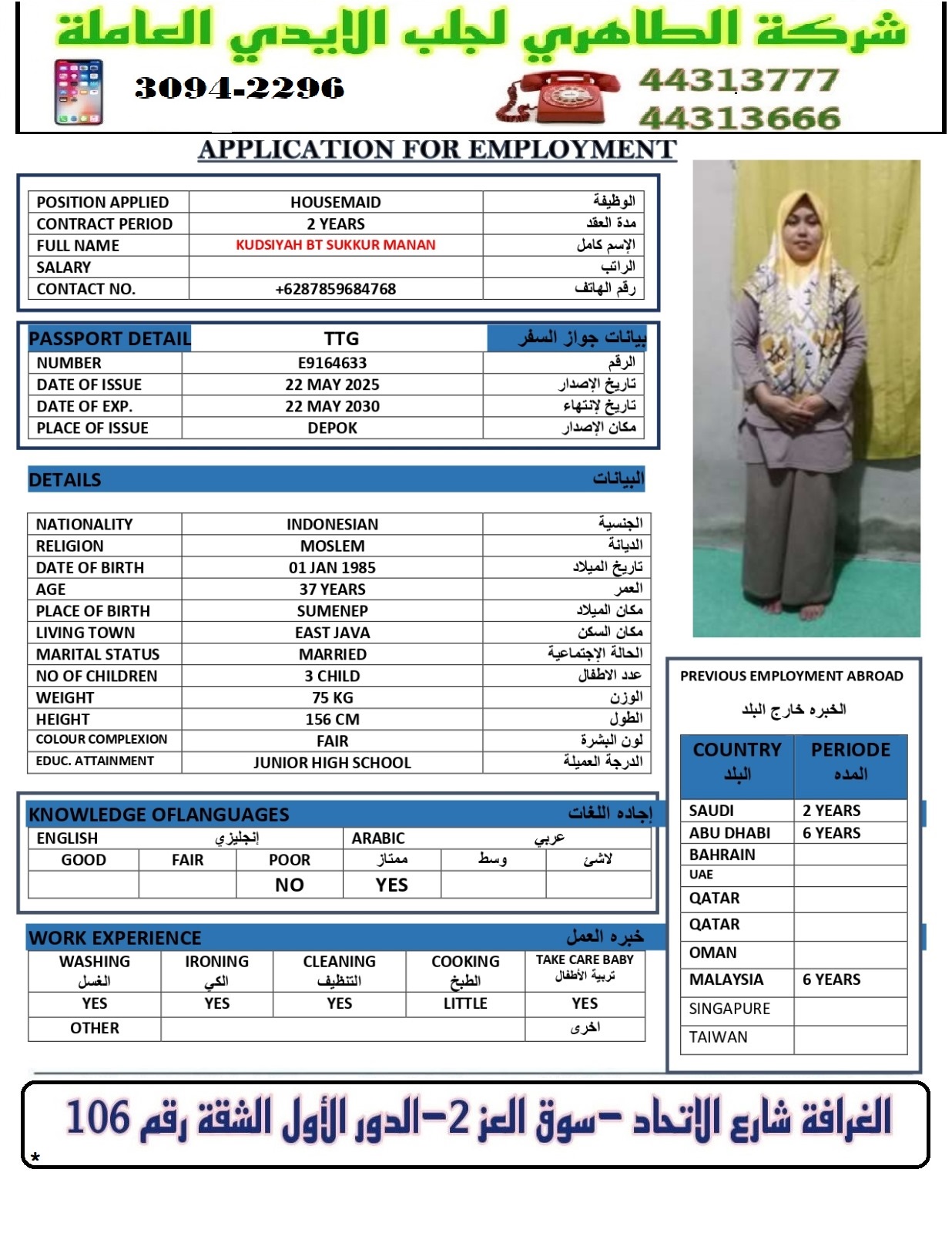 الاسم - عربي KUDSIYAH BT SUKKER MANAN_