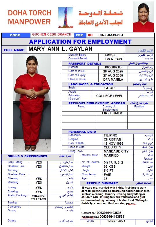 الاسم - عربي MARY ANN L GAYLAN