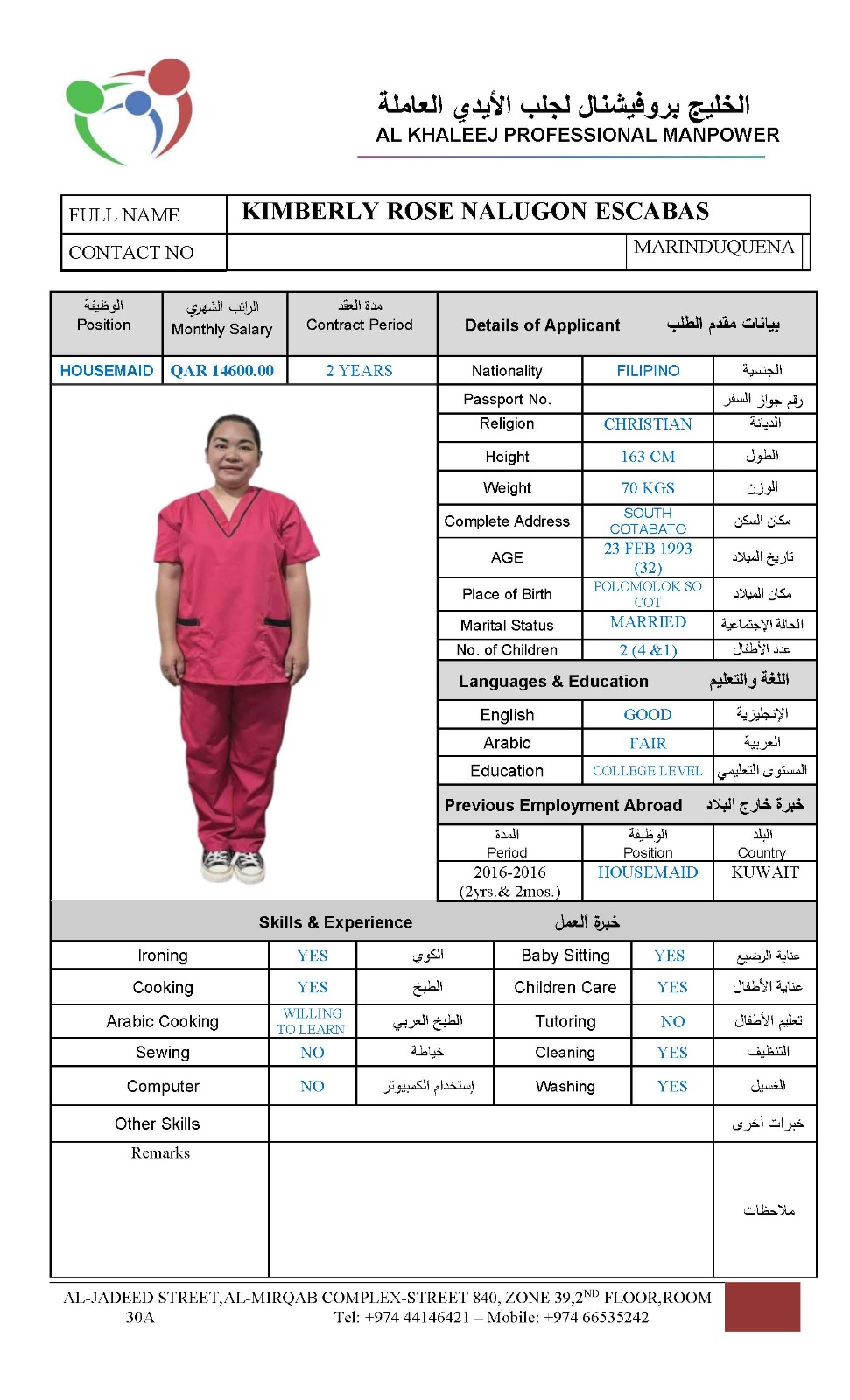 الاسم - عربي KIMBERLY ROSE NALUGON ESCBAS