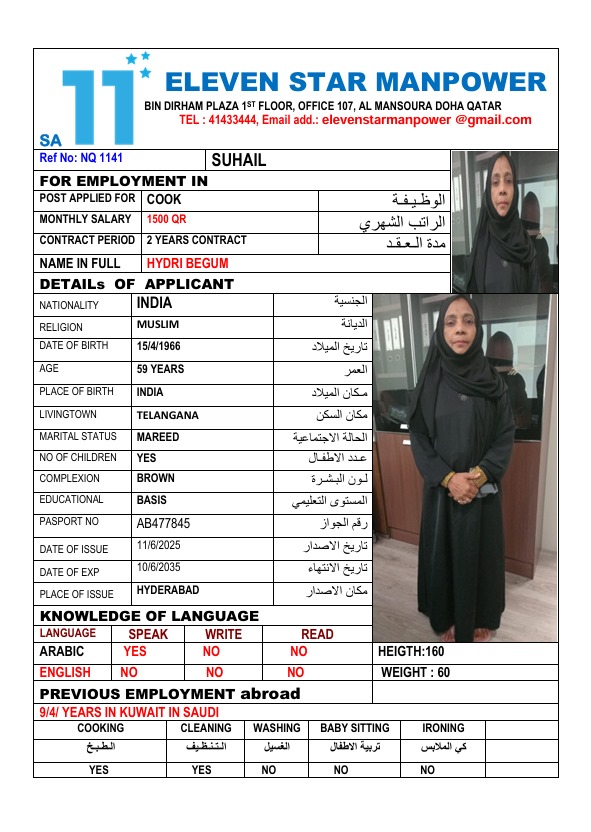 الاسم - عربي HYDRI BEGUM/ AVAILABLE COOK