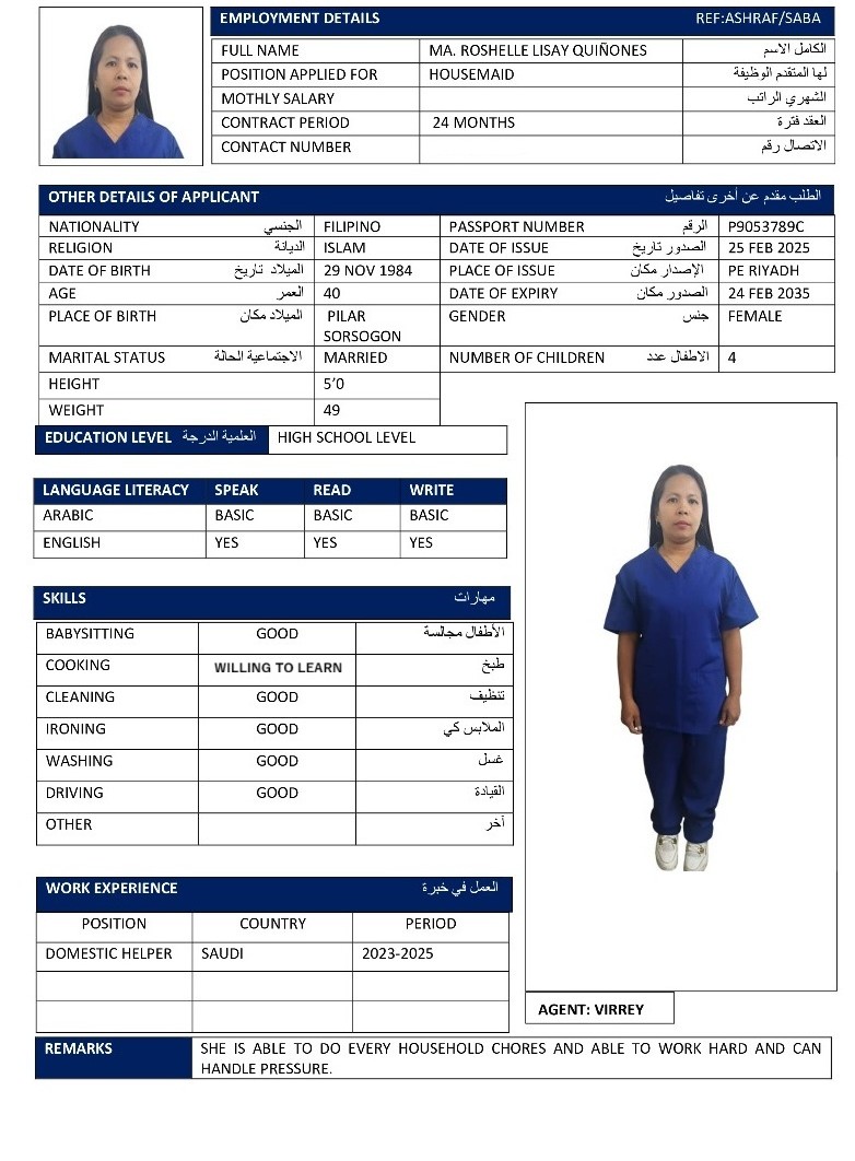 الاسم - عربي MA. ROSHELLE QUINONESS