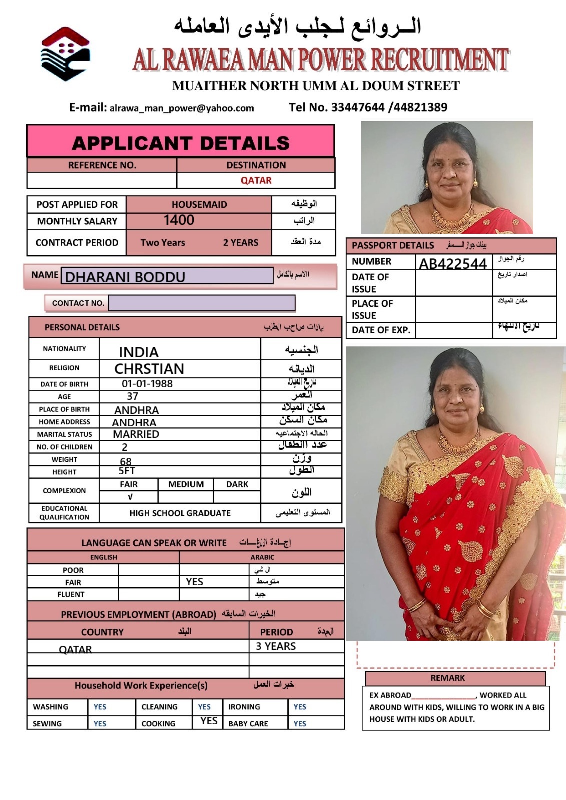 الاسم - عربي DHARANI BODDU BHYC